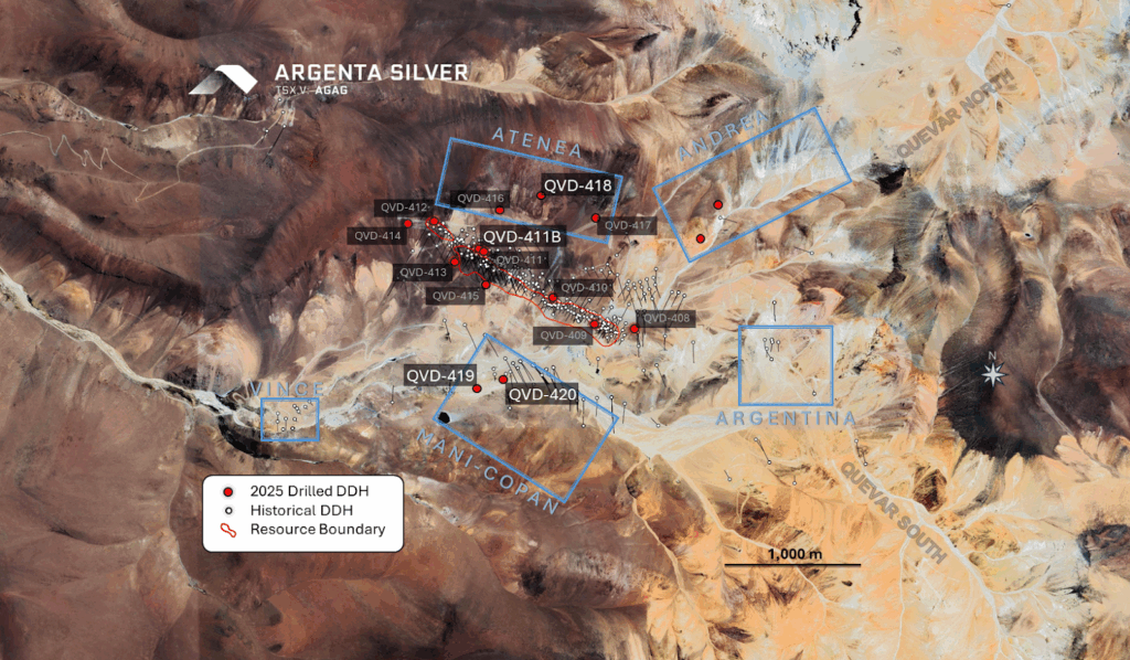 VANCOUVER, British Columbia, October 27 2025 /CNW/ – Argenta Silver Corp. (TSXV: AGAG) (OTCQB: AGAGF) (FSE: T1K) (“Argenta” or the “Company”) is pleased to announce the fourth set of assay results from its 2025 Winter Diamond Drilling Program (completed mid-September 2025) at the 100% owned El Quevar Project in Salta Province, Argentina. These results confirm high-grade silver intervals within the Yaxtché Deposit, notably including 694 g/t Silver over 2.1 meters and, while additional drill results highlight 204 g/t Silver over 2.00 meters at the Mani exploration target. Results from two remaining drillholes from the 2025 Winter Program are still pending from laboratory.