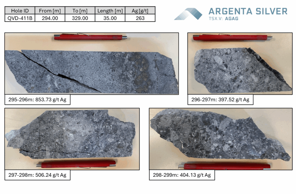 - QVD-411B: validates Yaxtché Deposit continuity with 263 g/t Ag over 35.00 meters, including 425 g/t Ag over 6.00 m, and 342 g/t Ag over 9.00 m, which also includes 694 g/t Ag over 2.1 m. The hole also intercepted gold values of 0.35 g/t Au over 1.00 m and 0.84 g/t Au over 1.00 m.