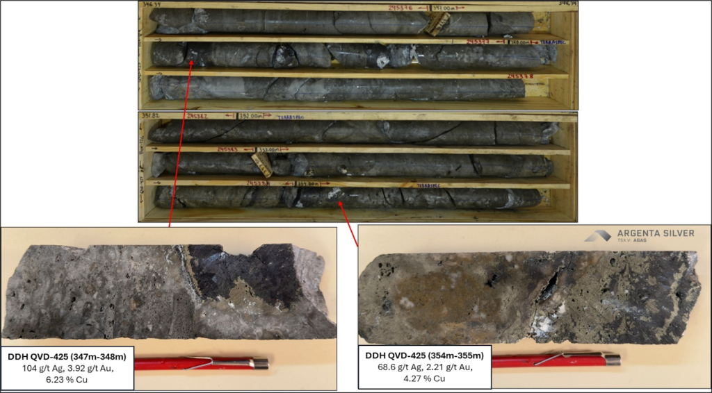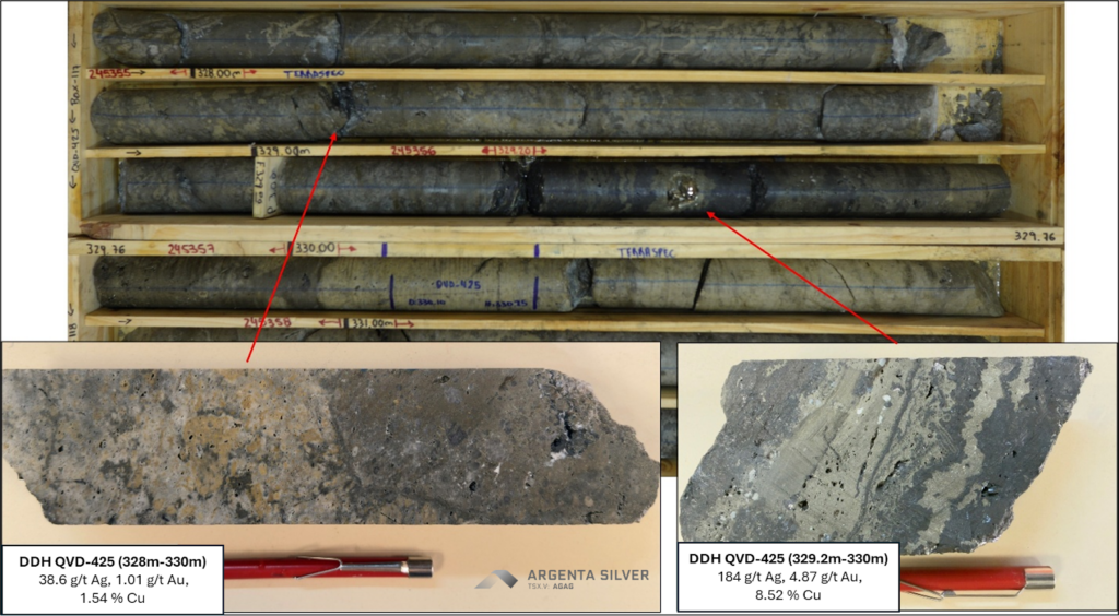 - QVD-423: the first hole of the 2025–2026 Summer Campaign, intersected 246 g/t Ag over 20.00m, including a high-grade intercept of 427 g/t Ag over 6.00m and a standout 1,075 g/t Ag over 1.00m. This intercept successfully tested a 100-meter gap previously devoid of drilling, confirming mineralization continuity with grades consistent with adjacent areas. *