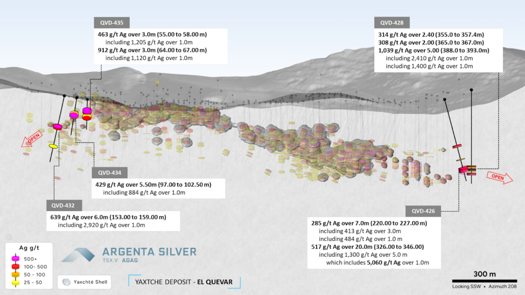 - QVD-426 (50-meter Northwest Step-out): Intersected 517 g/t Ag over 20.00m (from 326m), including a high-grade interval of 1,300 g/t Ag over 5.00m, which also contains 5,060 g/t Ag over 1.00m. These results confirm a 50-meter expansion to the northwest of the previously defined deposit margin (Figure 3).