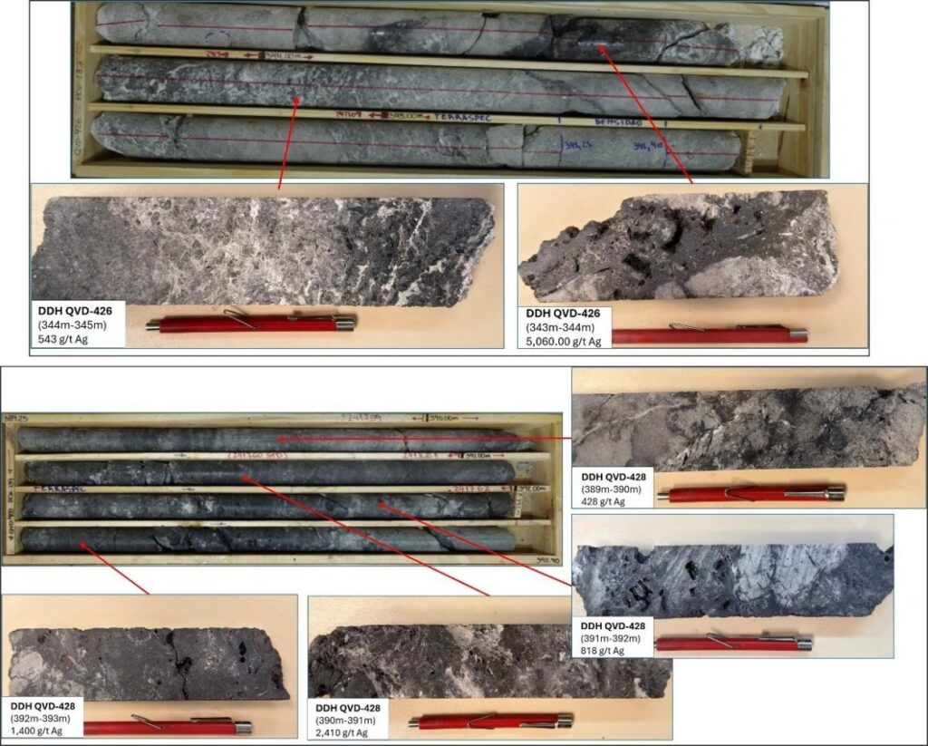 - Hole QVD-431 intersected 135 g/t Ag over 7.50m (from 25 m) and a deeper interval of 255 g/t Ag over 2.00m (from 89 m). Additionally, hole QVD-433 intersected a significant high-grade interval of 4,982 g/t Ag over 7.50m, including 6,850 g/t Ag over 4.50m, and 336 g/t Ag over 2.00 m (from surface). These results are consistent with previously reported high-grade surface samples (see news release July 21, 2025), confirming that the system remains active and robust in this exploration target.