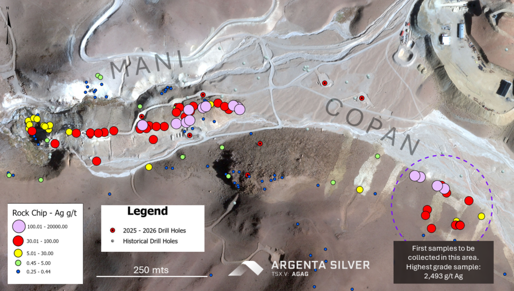 - Surface rock sampling from previously unsampled areas of the Mani-Copan target has returned more than a dozen high-grade silver assays reaching up to 2,493 g/t Ag, further highlighting the significant growth potential of these new mineralized zones (Figure 4 and Table 3).