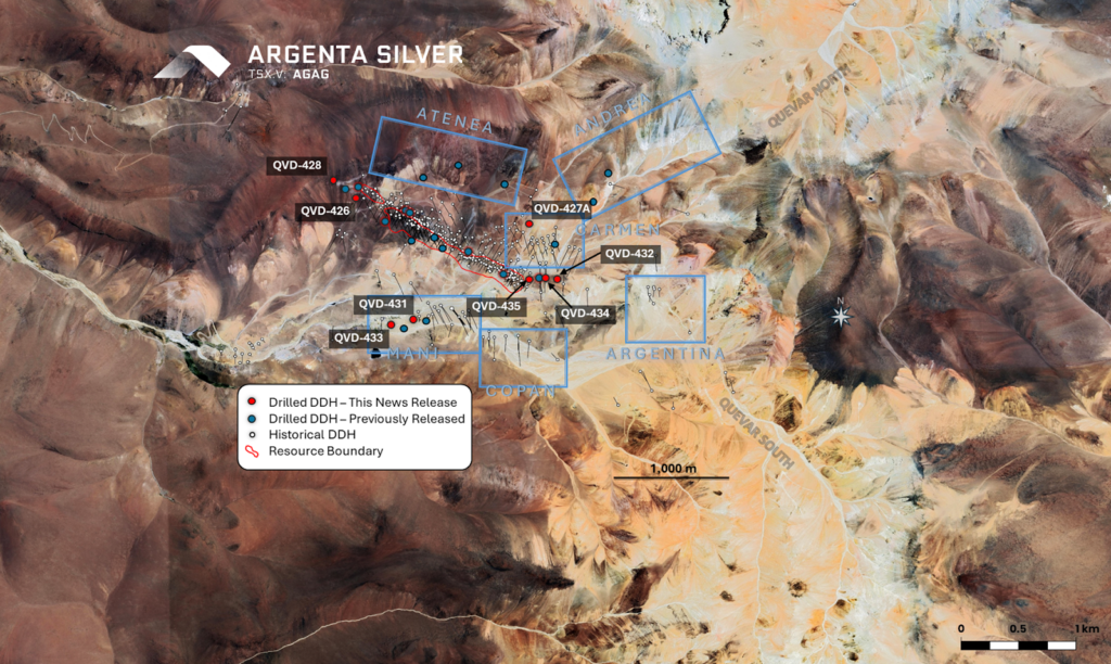 VANCOUVER, British Columbia, February 23, 2026 /CNW/ – Argenta Silver Corp. (TSXV: AGAG) (OTCQX: AGAGF) (FSE: T1K) (“Argenta” or the “Company”) is pleased to report the second set of assay results from its ongoing 2025–2026 Summer Exploration Program at the 100% owned El Quevar Project (“El Quevar”) in Salta Province, Argentina. These latest results confirm multiple high-grade silver intervals beyond the Yaxtché Deposit (“Yaxtché”), demonstrating mineralized continuity over a 100-meter northwest extension (step-out holes QVD-426 and QVD-428) and a 170-meter southeast extension (including step-out hole QVD-432 and others) (Figure 1, Figure 2, Table 1, and Table 2). Notably, additional high-grade drill and surface sample results continue to emerge from the Mani-Copan target, located approximately 500 meters south of Yaxtché (QVD-433 and others). Furthermore, the Company has confirmed the gold-copper mineralized zone in a follow-up drill hole at the Carmen target.