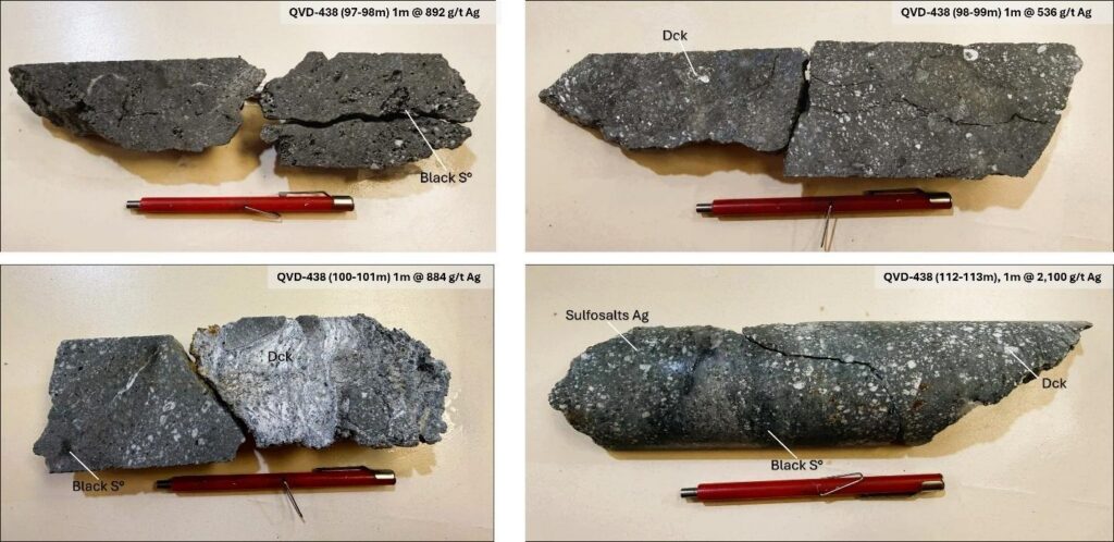 Figure 4. Detailed photos of QVD-438 showing clear evidence of high-grade mineralization continuity within intercepts of 661 g/t Ag over 4.0m and 838 g/t Ag over 4m, notably including the interval from 112 to 113 meters which returned 2,100 g/t Ag over 1.0m.