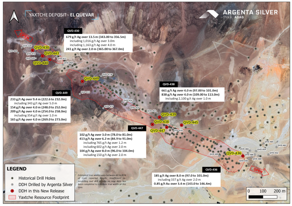 VANCOUVER, British Columbia, April 16, 2026 /CNW/ – Argenta Silver Corp. (TSXV: AGAG) (OTCQX: AGAGF) (FSE: T1K) (“Argenta” or the “Company”) is pleased to report the third set of assay results from its ongoing 2025–2026 Summer Diamond Drilling Campaign at the El Quevar Project in Salta Province, Argentina. The latest multiple high-grade silver intervals intersected outside the Yaxtché Deposit (“Yaxtché”) resource limits, continue demonstrating mineralized continuity over the northwest extension (step-out holes QVD-430, QVD-440, and QVD-443) and in the southeast extension (including step-out hole QVD-436) (Figure 1, Figure 2, Table 1, and Table 2). Notably, other holes successfully intercepted high-grade silver within >100-meter spacing between existing drill holes within the Yaxtché Deposit; specifically, hole QVD-438 returned 2,100 g/t Ag over 1.0m. These results confirm the continuity of mineralization in areas previously devoid of drilling, effectively de-risking the central part of the deposit.